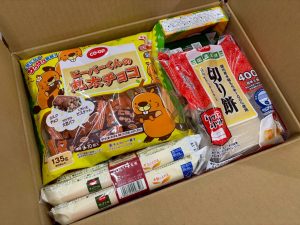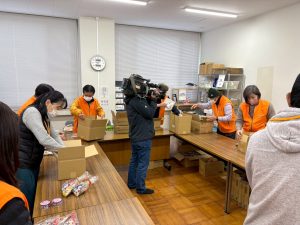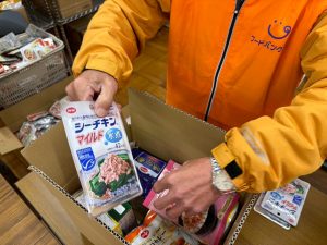 少しでも安心して年末年始を迎えていただけるよう、保存がきき、日々の食事に役立つ食品を中心に、ボランティアの皆さん、スタッフを含め、約15名で、一世帯ずつ心を込めて箱詰めしました。